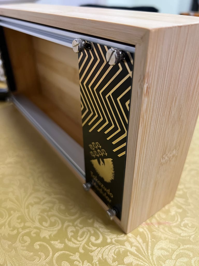 「IKEAのケースでEurorackケースが作れるよ!」という投稿をTwitterで見て、初めて作ったEurorackケース。IKEAの木製ケース(Tavelanタヴェロン,~¥1,500)にエヌアイシー オートテック(NIC)社製レール(AFS-1020-4,切り売り~¥3,000)を取りつけたもの。NIC製ナットネジ(NSMS-04-3,~¥1,000)を含めると、総額¥5,500ぐらいでDIYケースができる(電源は別途必要)。レールを取り付けるために、箱に正確に穴を開ける必要があるので、ボチボチめんどくさい(レールがずれているとモジュールがハマらない)。