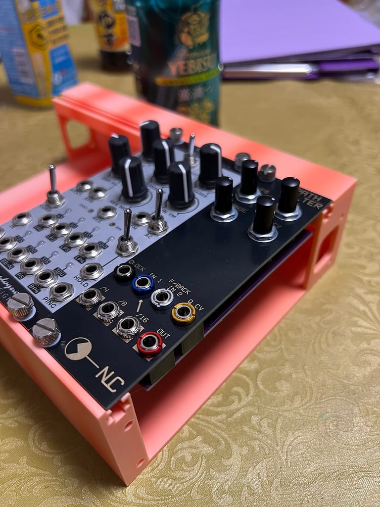 3Dプリンタで作成した弐號ケースは電源スペースがケース底しかなく、電源やフラットケーブルがモジュールに抵触する事があったので、改良して電源用スペースを設けたのがこの参號ケース。弐號ケースと同様、21HPが基本になっていて、ネジと六角ナットで連結して増設できるようになっている(右写真は21+21=42HP)。