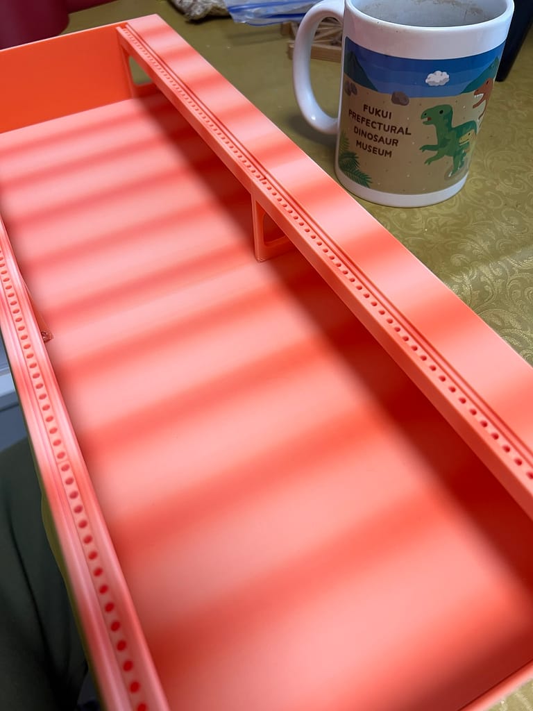 次に作ったのが、3Dプリンタで作成した42HPのケース(材質はPLA)。21HPのケースを連結して42HPにしている(21HPをベースにしたのは、3Dプリンタの印刷サイズの制約のため)。モジュール取り付け用M3ネジ穴の部分に上記のNIC社製のナットと互換性があるように設計してあるが、結局、ネジ穴も3Dプリンタで別途吐き出すようにした(よっぽど強くネジ絞めなければ、ネジ穴の強度は保てそうと判断)。すごくコンパクトなケースなので、デザインは気に入ってはいるが、残念ながら電源の設置スペースがあまり無い。